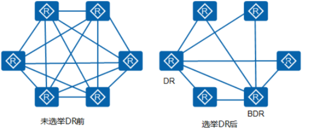 在广播网和NBMA网络中,任意两台路由器之间都要传递路由信息。如图所示,网络中有n台路由器,则需要建立n*(n-1)/2个邻接关系。这使得任何一台路由器的路由变化都会导致多次传递,浪费了带宽资源。为解决这一问题,OSPF定义了指定路由器DR和备份指定路由器BDR。通过选举产生DR(Designated Router)后,所有路由器都只将信息发送给DR,由DR将网络链路状态LSA广播出去。除DR和BDR之外的路由器(称为DR Other)之间将不再建立邻接关系,也不再交换任何路由信息,这样就减少了广播网和NBMA网络上各路由器之间邻接关系的数量。