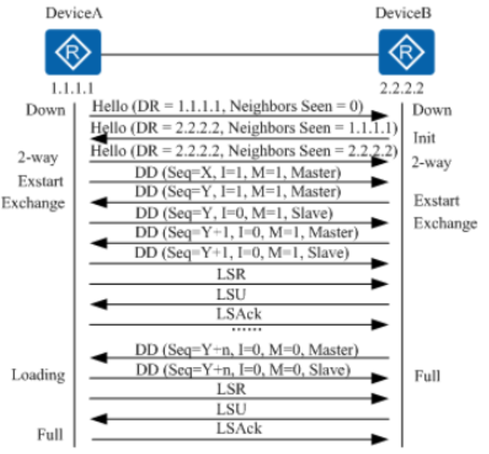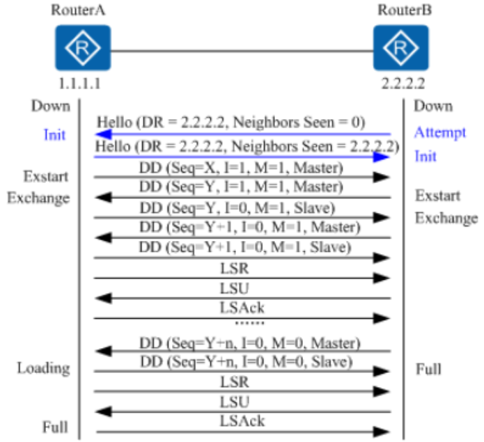 上述过程持续到RouterA中的LSA与RouterB的LSA完全同步为止,此时RouterA将RouterB的邻居状态机改为Full状态。当路由器交换完DD报文并更新所有的LSA后,此时邻接关系建立完成。