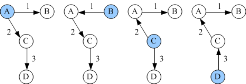 每台路由器根据有向图,使用SPF算法计算出一棵以自己为根的最短路径树,这棵树给出了到自治系统中各节点的路由。如图所示。