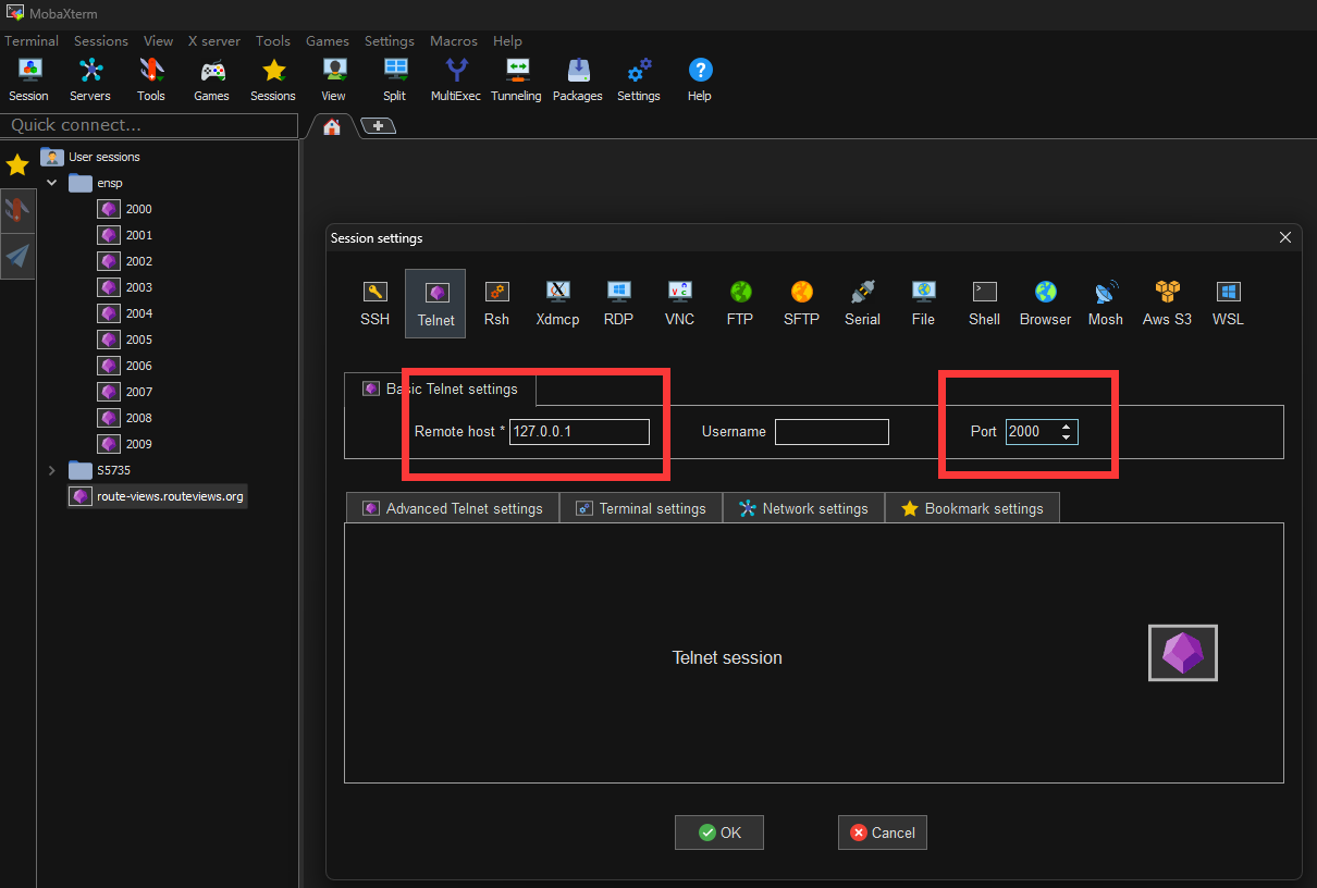 想要通过mobaxterm在终端工具中登录ensp中的设备,直接创建telnet会话,不需要用户名和密码,用端口号进行区分设备。