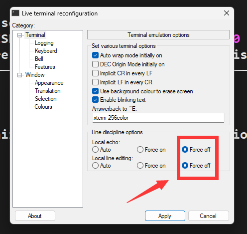 但是每次重新开启会话后都需要修改live terminal configuration中的line discipline options选项全部设置为force off。网上搜了一下很多都处理不了,借鉴了一下添加命令终于处理好。