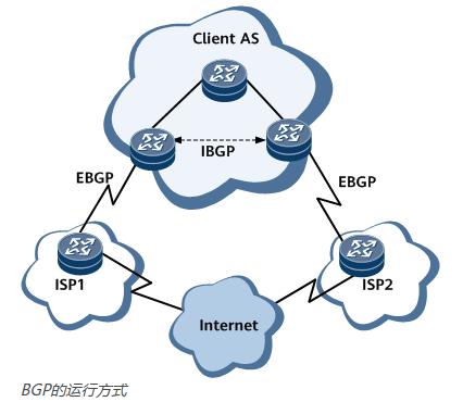 BGP有两种运行方式,当BGP运行于同一AS内部时,被称为IBGP(Internel BGP,内部边界网关协议);当BGP运行于不同AS之间时,称为EBGP(Externel BGP,外部边界网关协议)。如图1 BGP的运行方式所示: