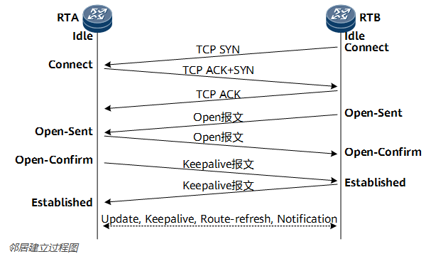BGP对等体双方的状态必须都为Established,BGP邻居关系才能成立,双方通过Update报文交换路由信息。