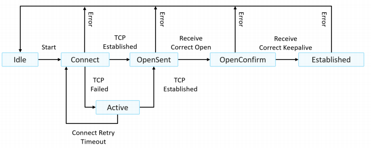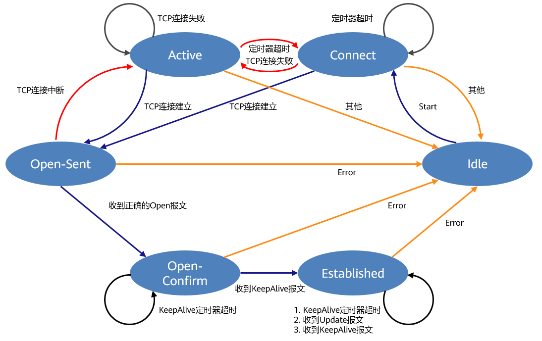 BGP有限状态机共有六种状态,分别是Idle、Connect、Active、Open-Sent、Open-Confirm和Established。