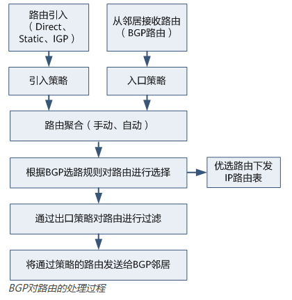 BGP对路由的处理如图 BGP对路由的处理过程所示。BGP路由来源包括从其他协议引入和从邻居学习两个部分,为了减少路由规模,可以对优选的BGP路由进行聚合。在引入路由、从邻居接收或发送路由的过程中,可以通过路由策略实现对路由的过滤,也可以修改路由的属性。