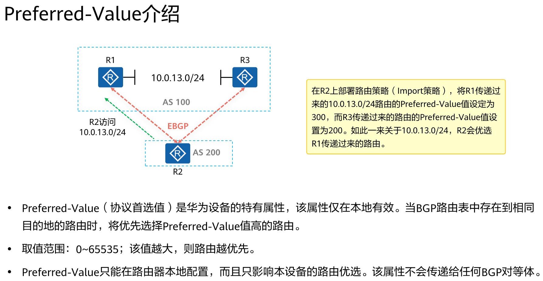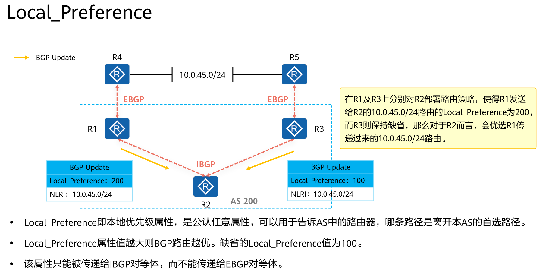 | Local_Pref属性 | 公认任意 | 仅在IBGP对等体之间有效,不通告给其他AS,用于表明路由设备的BGP优先级。 |