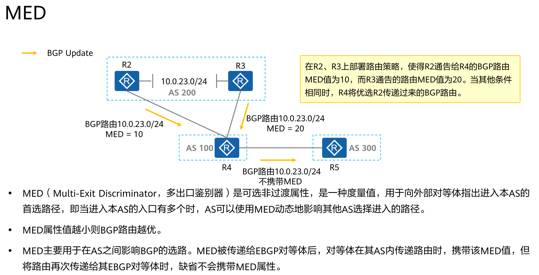 | MED | 可选非过渡 | MED(Multi-Exit-Discriminator)属性仅在相邻两个AS之间传递,收到此属性的AS一方不会再将其通告给任何其他第三方AS。 |