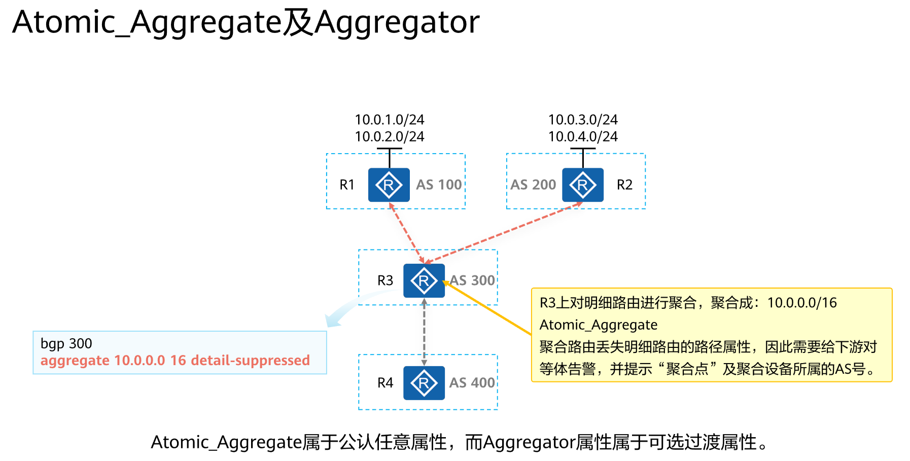 聚合路由会丢失明细路由的路由属性,因此需要给下游BGP对等体告警,并提示“聚合点”及“聚合设备所属的AS号”。