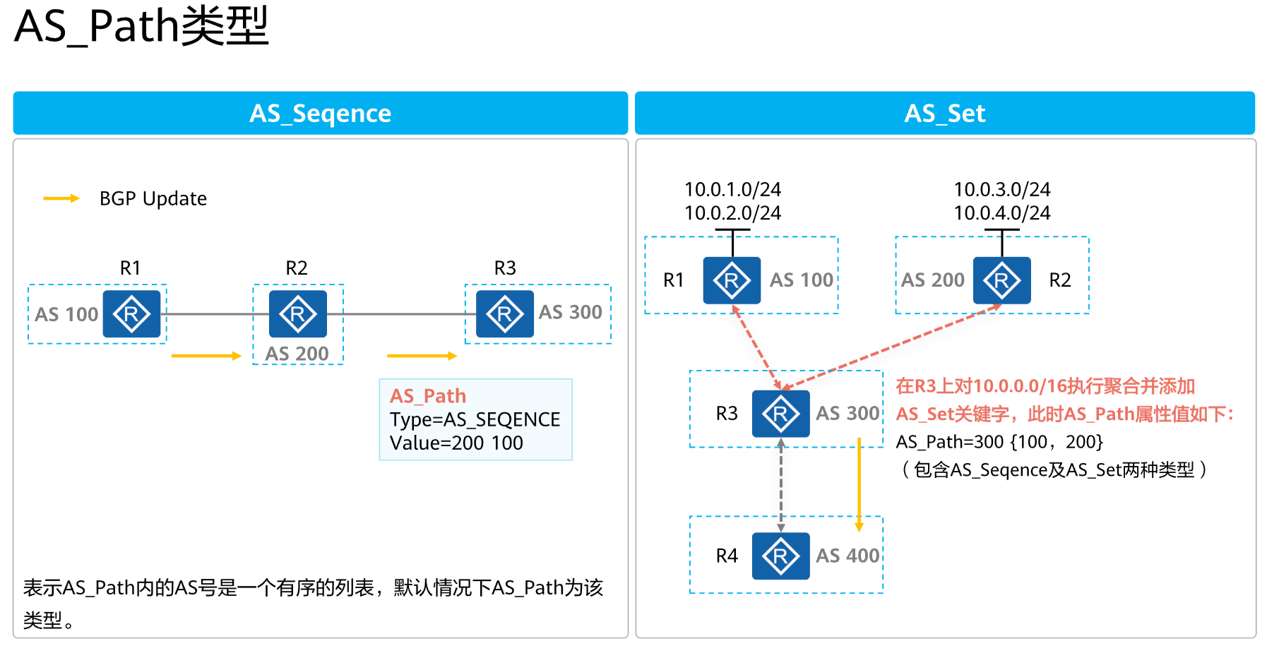 - 丢弃AS_PATH属性中包含本AS号的路由(防止AS间环路)